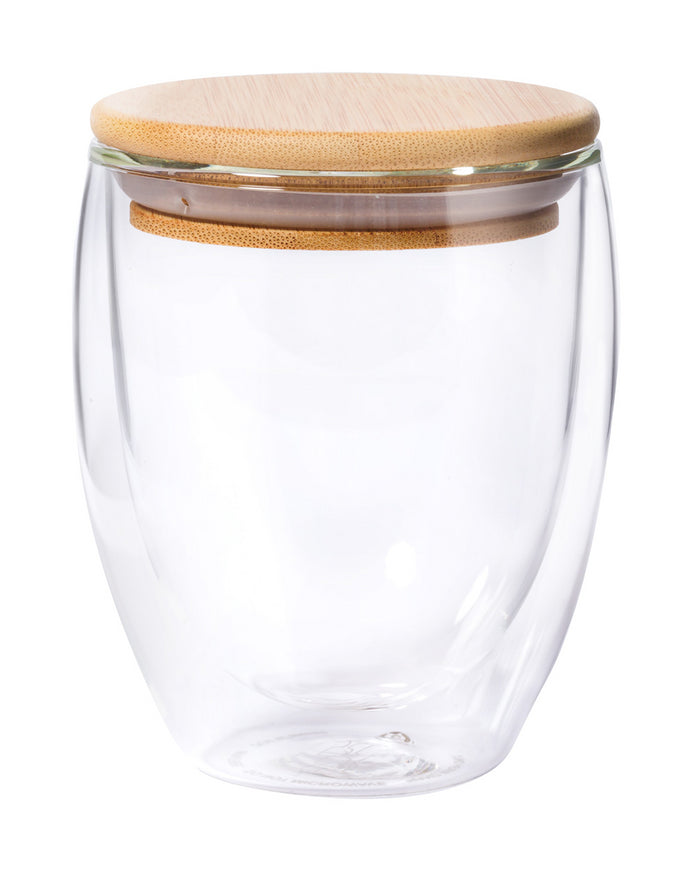 Cană termică din sticlă borosilicată cu perete dublu, cu capac din bambus, 250 ml. În cutie de hârtie kraft.