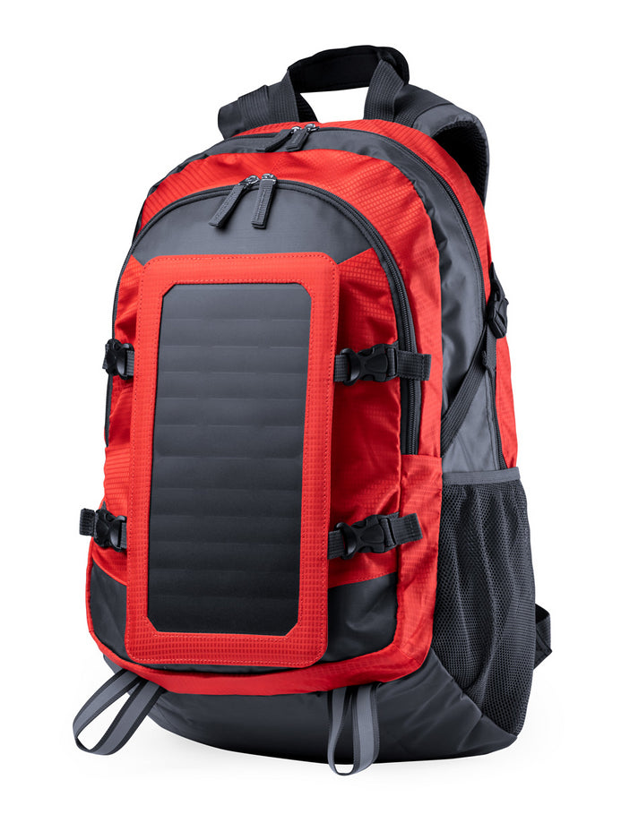 Rucsac din material rezistent la apă, cu panou solar detașabil, cu port încărcător USB. Mai multe compartimente cu fermoar. Compartiment căptușit pentru laptop, cu spate și bretele întărite.
