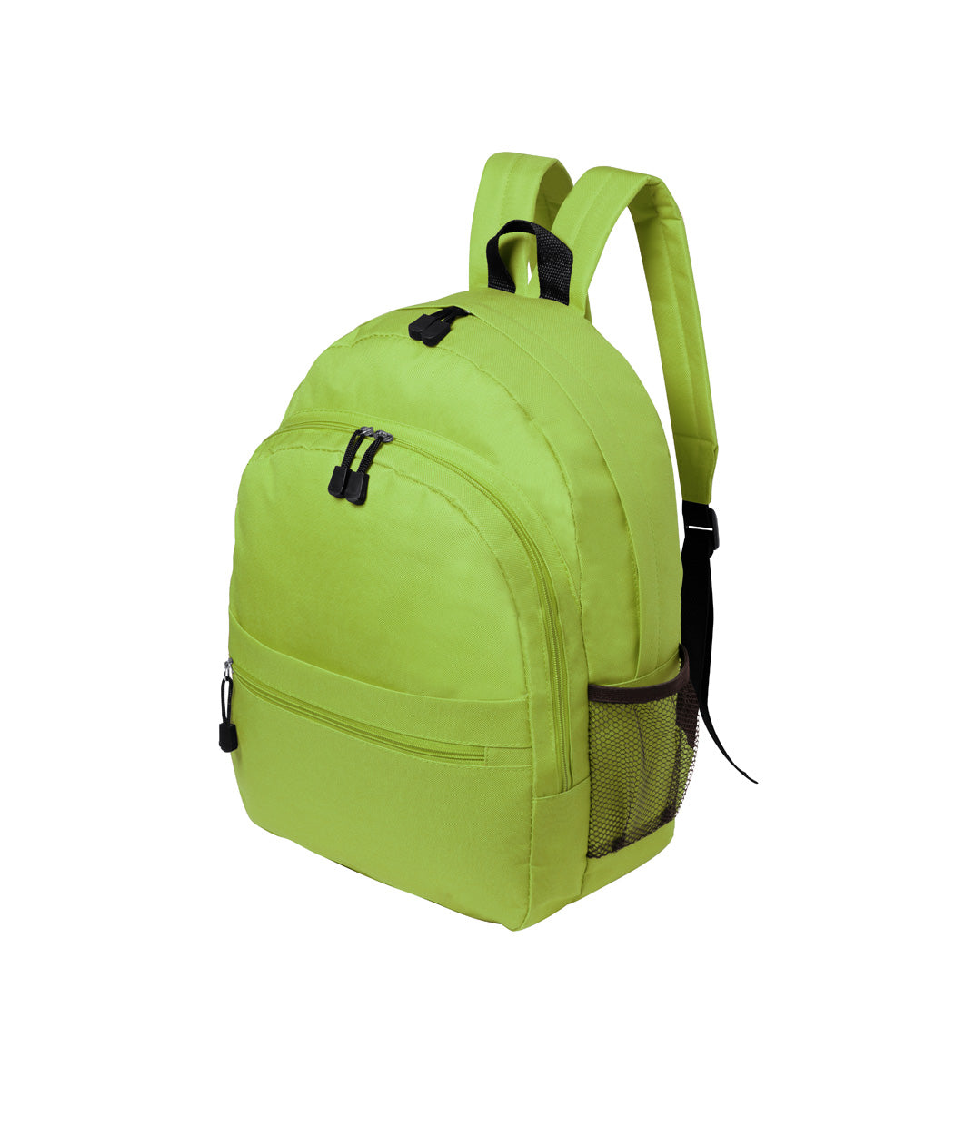 Rucsac cu două buzunare frontale cu fermoar și buzunar lateral din plasă, spate și curele de umăr căptușite. Poliester 600D