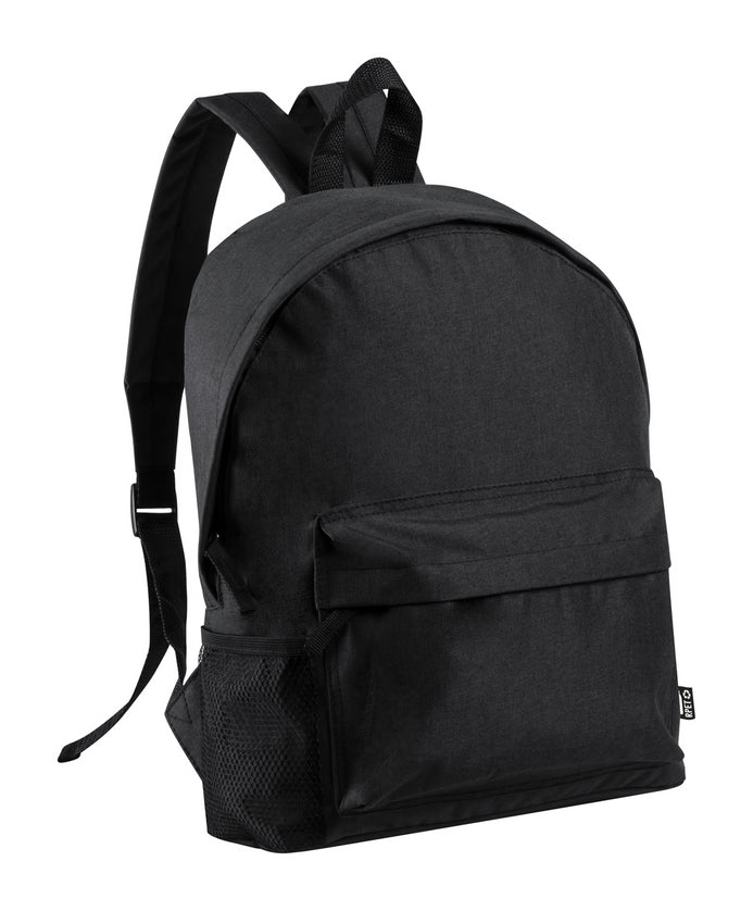 Rucsac cu buzunar frontal cu fermoar, buzunar lateral cu plasă, spate și bretele căptușite. Poliester PET reciclat 600D. Cu etichetă distinctă RPET.