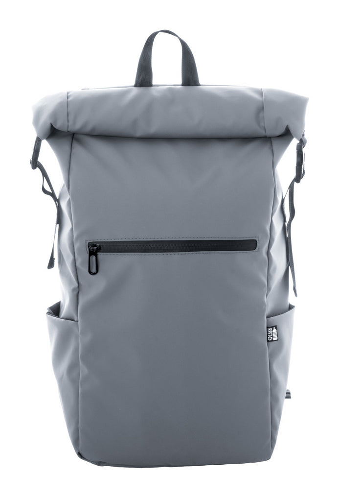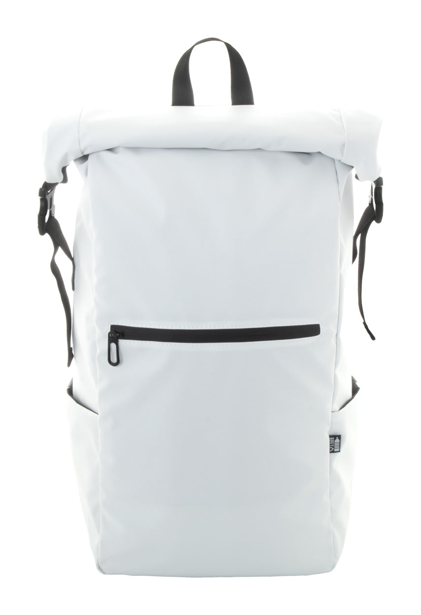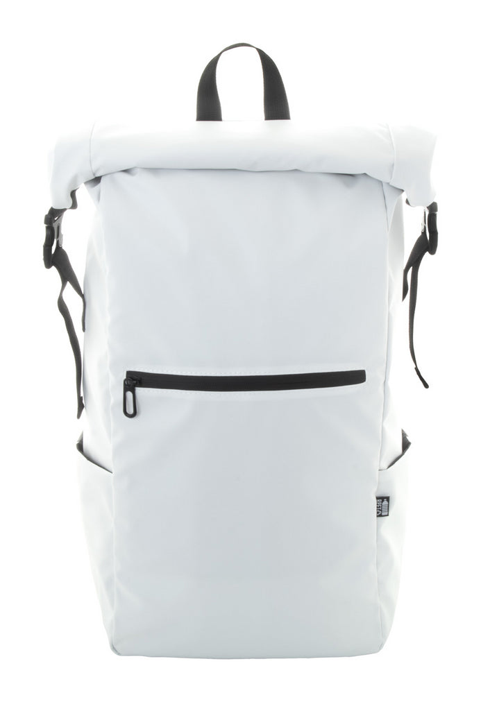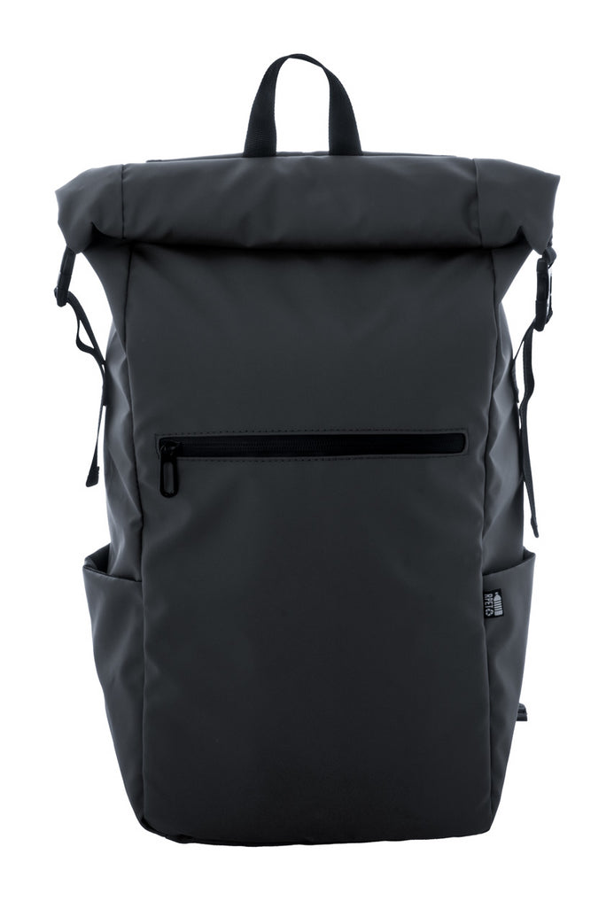 Rucsac rolltop, impermeabil, din RPET, cu cataramă și închidere cu velcro, compartiment căptușit pentru laptop (16") și tabletă (10"), buzunar frontal cu fermoar, buzunare laterale, spate și bretele căptușite. Poliester 600D RPET acoperit cu PU, cu etichetă RPET distinctă.